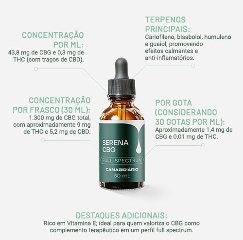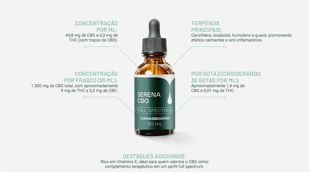 O Serena CBG destaca-se como uma opção inovadora para quem procura os benefícios do CBG, um canabinóide não psicoativo conhecido por suas propriedades moduladoras. Este óleo full spectrum combina alta concentração de CBG com baixos níveis de THC, tornando-o perfeito para rotinas diárias focadas em foco e relaxamento. Enriquecido com Vitamina E, ele apoia a vitalidade e o equilíbrio holístico.